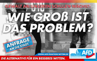Unserer Fraktion liegen mehrere Fälle vor, die ein erschreckendes Bild von Straftaten an Wittens Schulen zeigen. Berichtet wurde von Diebstählen, körperlicher Gewalt und massiven Bedrohungen gegen Kinder, Lehrer und einschreitende Eltern. Teilweise wurden die Taten [...]