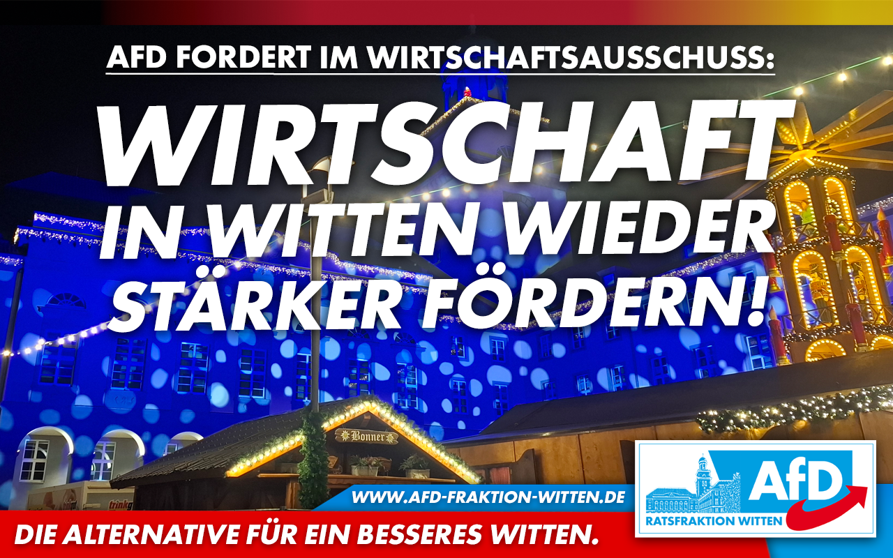 Die AfD Ratsfraktion in Witten kündigt im Ausschuss für Wirtschaft und Liegenschaften (AWL) neue wirtschaftsfördernde Akzente an, damit die heimische Wirtschaft durch die Politik zukünftig wieder besser unterstützt wird.